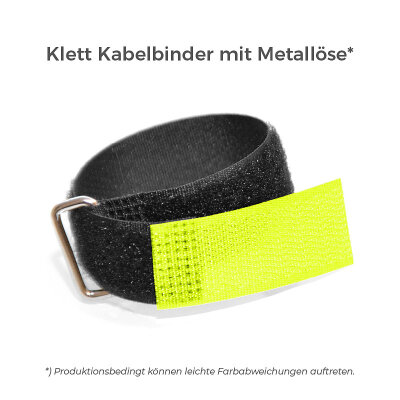 Klett Kabelbinder mit stabiler Metallöse in verschiedenen Ausführungen. Zum festen Anbringen am Kabel (üblich in der Veranstaltungstechnik) oder lösbar. FEST: Haken und Flausch auf entgegengesetzter Seite, LÖSBAR: Haken und Flausch auf gleicher Seite.